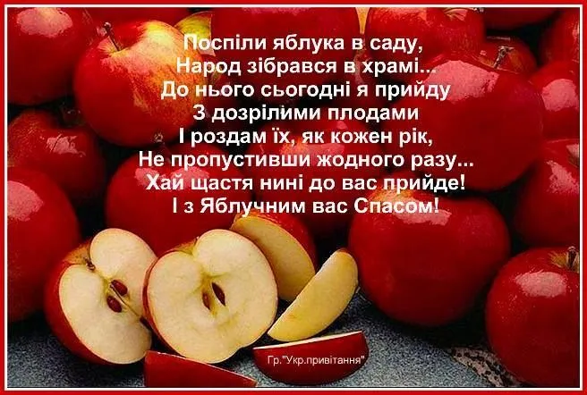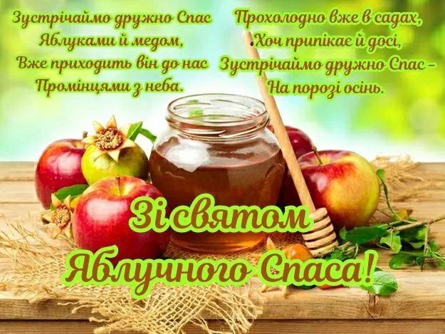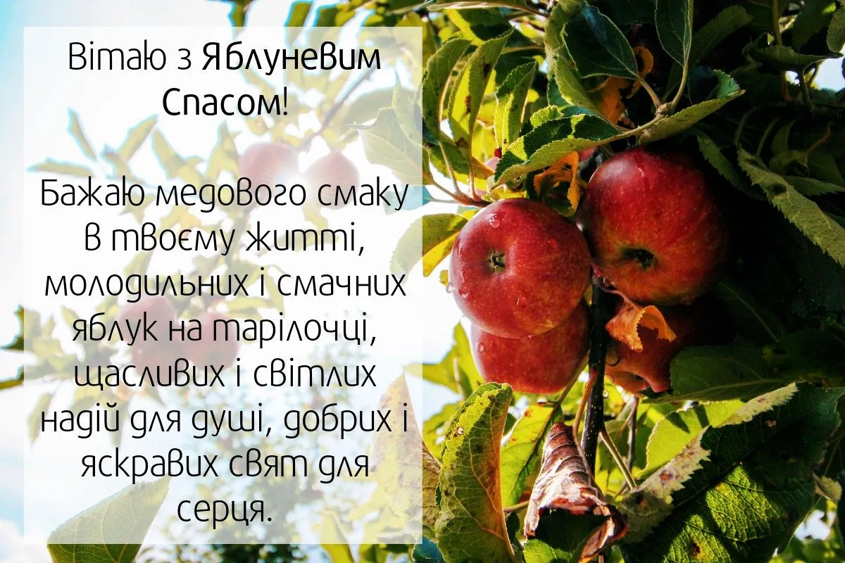 Вітаю з Яблучним Спасом! І всім серцем бажаю медового смаку щастя у житті. Соковитих смачних яблук у кошику. Звільнення душі від усього сумного і недоброго. Нехай життя буде солодким і соковитим, як стигле яблуко, нехай буде лад у сім'ї!