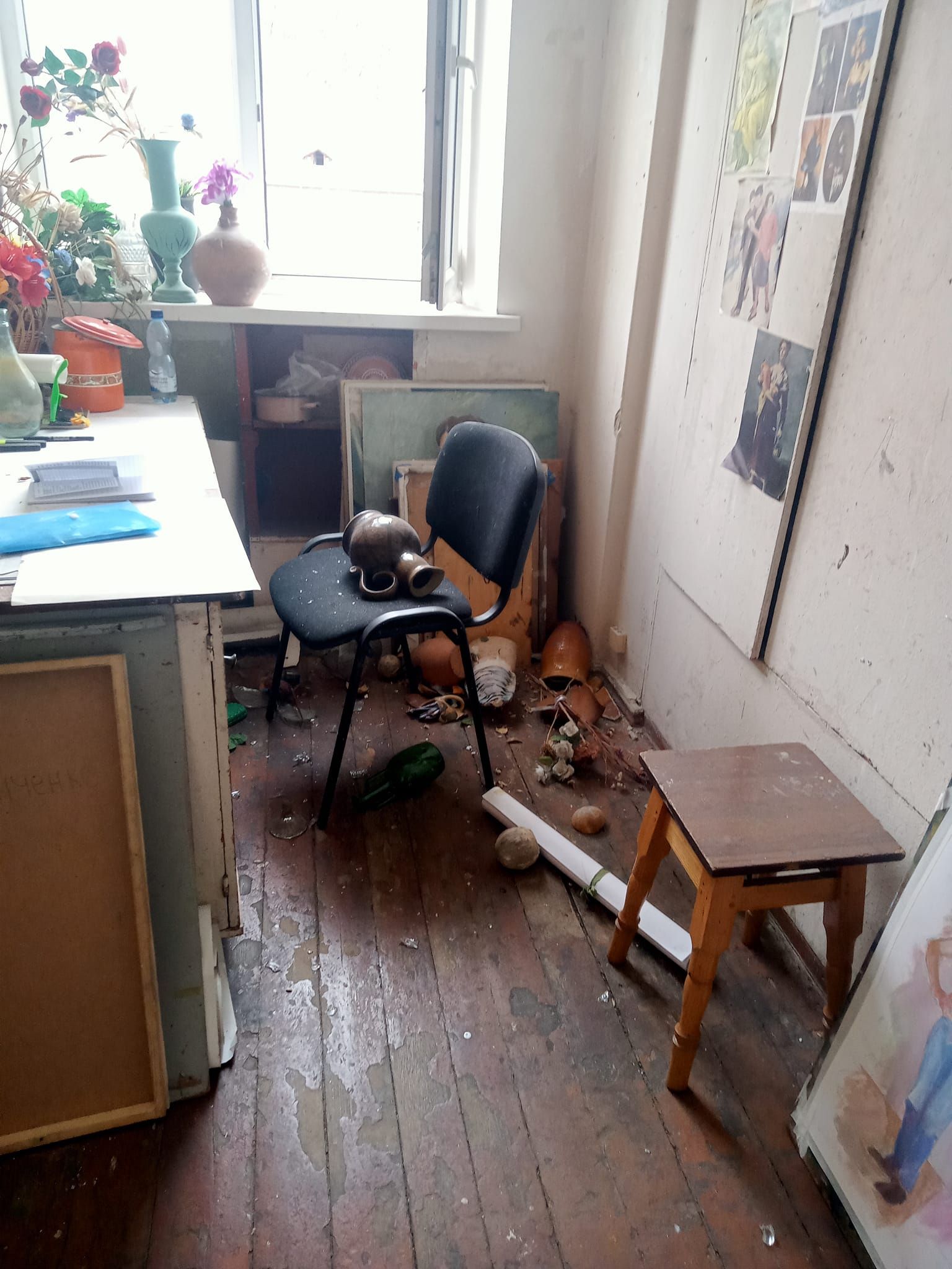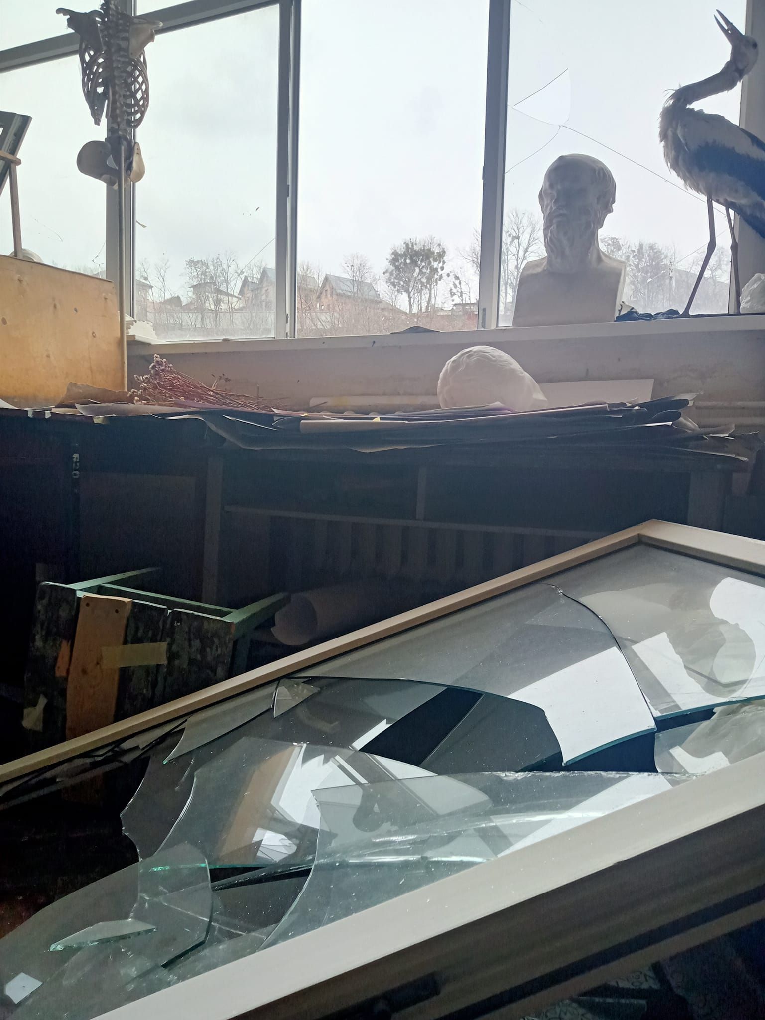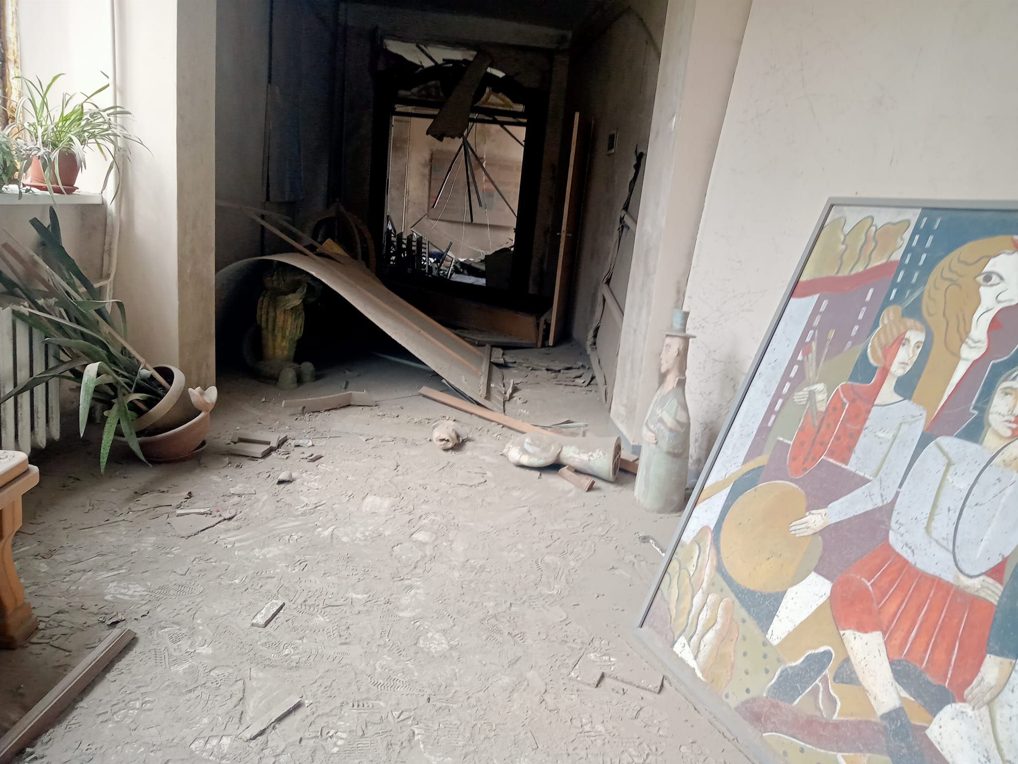 Художник показав, що сталося із кабінетом після "прильоту". На кадрах видно розбиті вікна, побиту стелю та всипану склом підлогу.