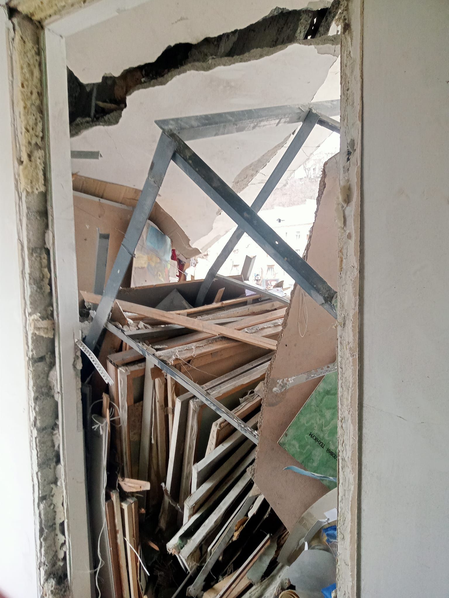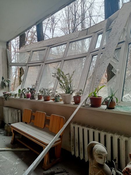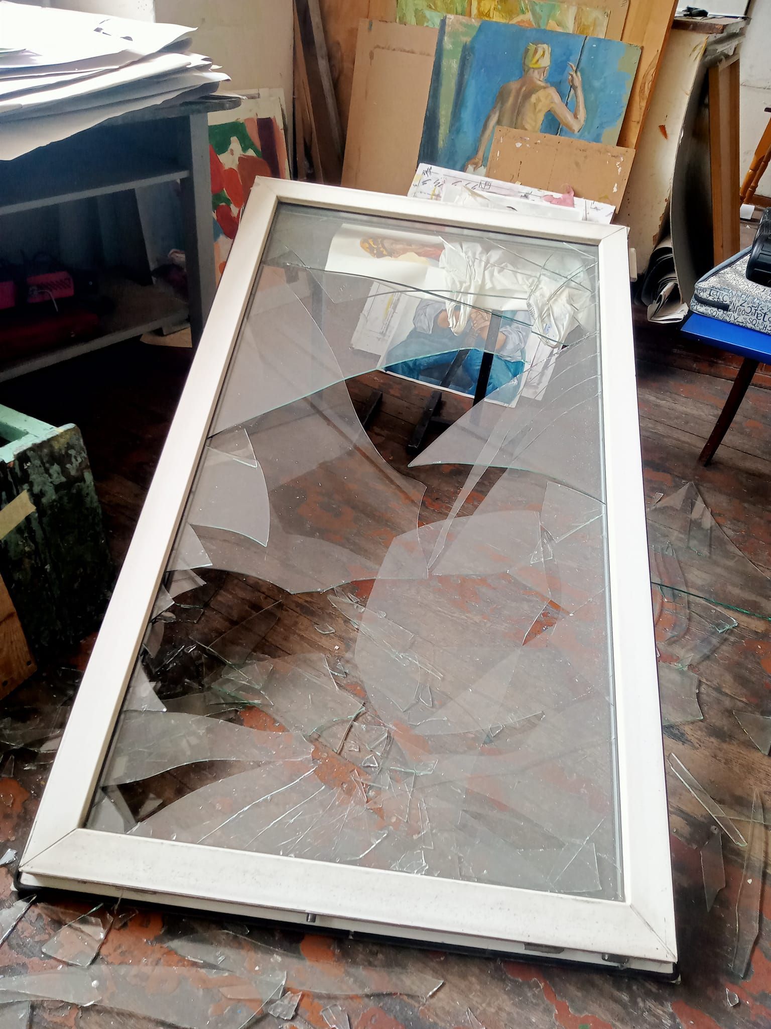Художник показав, що сталося із кабінетом після "прильоту". На кадрах видно розбиті вікна, побиту стелю та всипану склом підлогу.