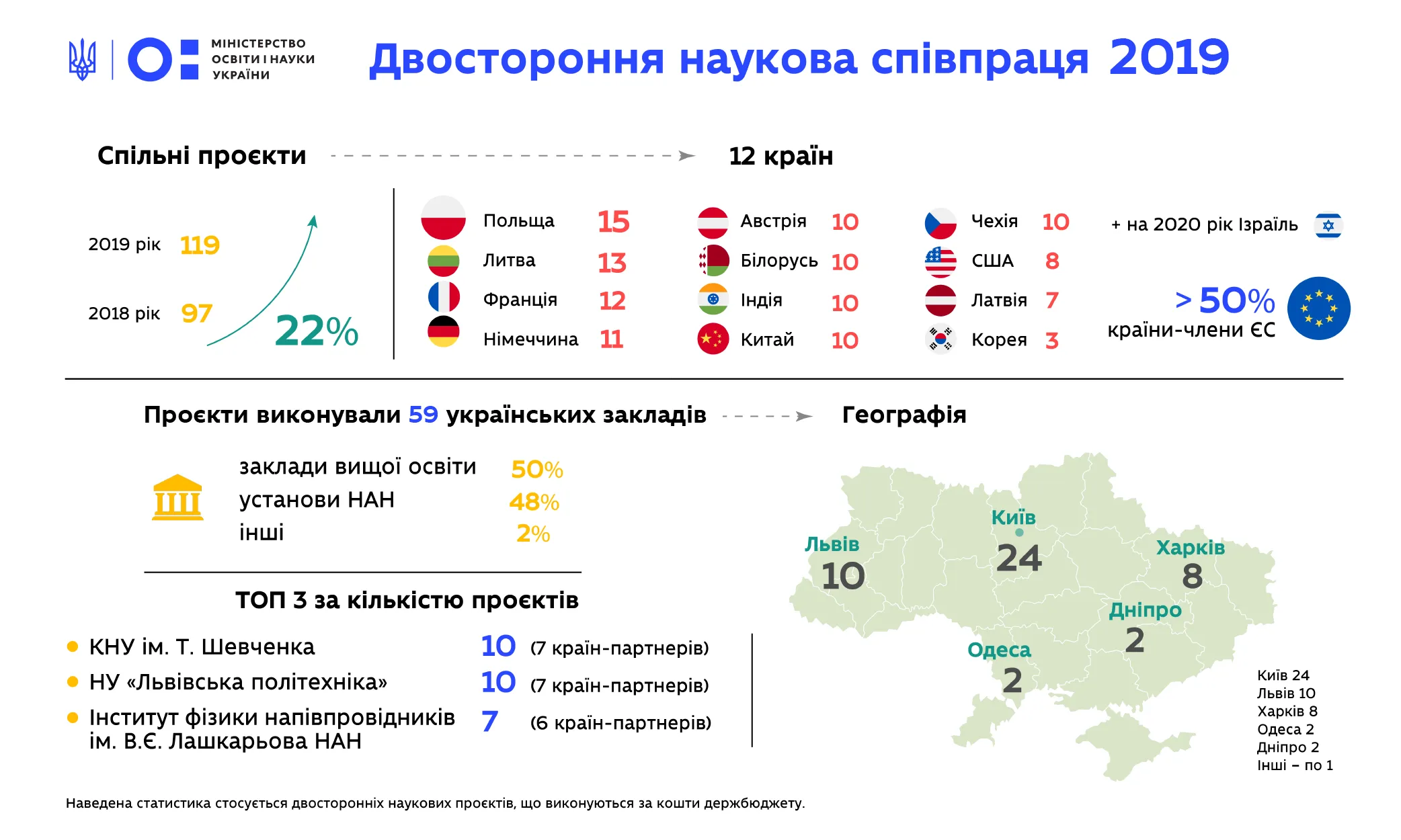 Від української сторони в 2019 році спільні проєкти з іноземними науковими установами виконували 59 закладів. Найбільше проєктів проводилось працівниками Київського національного університету, Львівської політехніки та Інститутом фізики напівпровідників імені Вадима Лашкарьова (Київ).