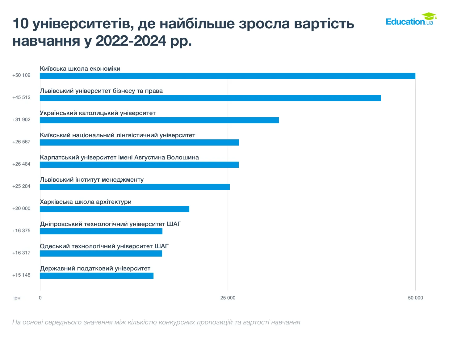 Аналіз конкурсних пропозицій 2022 – 2024 року дозволив виокремити десятку ЗВО, які стрімко підвищили вартість навчання. Лідери – приватні виші. Зокрема, у Київській школі економіки середня вартість навчання за останні 2 роки зросла на понад 50 тисяч гривень, а у Львівському університеті бізнесу і права – на 45 тисяч гривень.