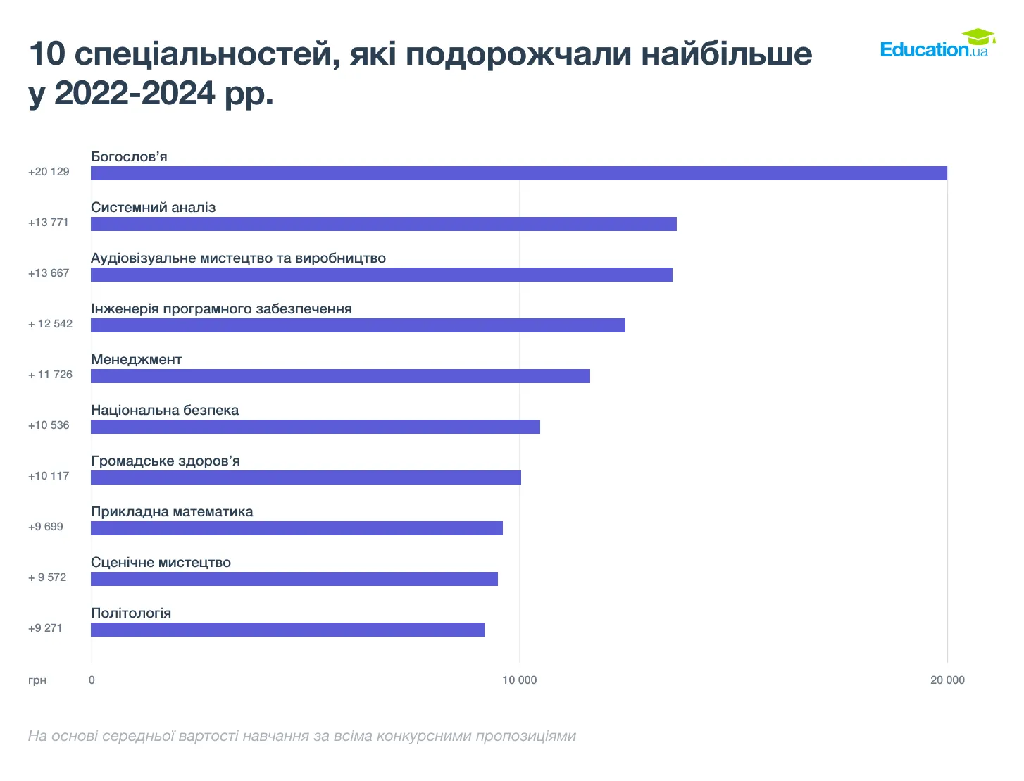 Проаналізувавши конкурсні пропозиції 2022 – 2024 років, Education.ua сформував десятку спеціальностей, де вартість навчання підвищилася найстрімкіше. До цього переліку увійшли гуманітарні та ІТ-спеціальності, а от першість уже другий рік поспіль тримає спеціальність "Богослов'я". На неї з 2022 року вартість зросла на 20 129 гривень.