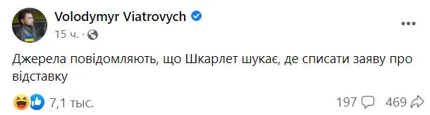 - Шкарлет вже написав заяву на звільнення. Що цікаво, зробив у ній помилку: написав неправильно своє прізвище – "Шарлет" замість "Шкарлет".