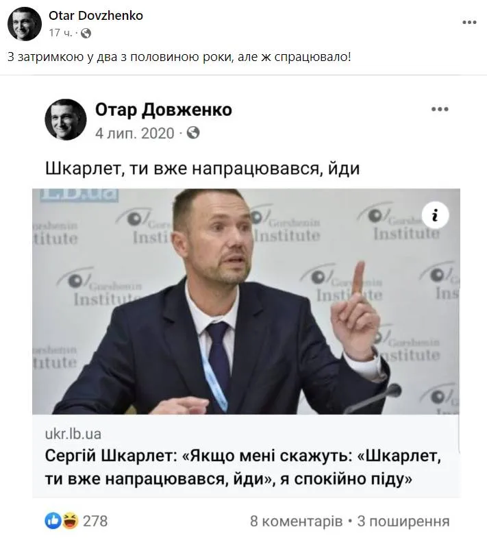 У дописі про відставку Шкарлета депутатка Інна Совсун написала: