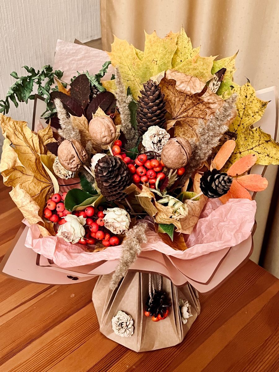 Серед найпопулярніших поробок – букети з сухоцвітів, троянди з листя чи осінні композиції, а ще вінки та парасольки.