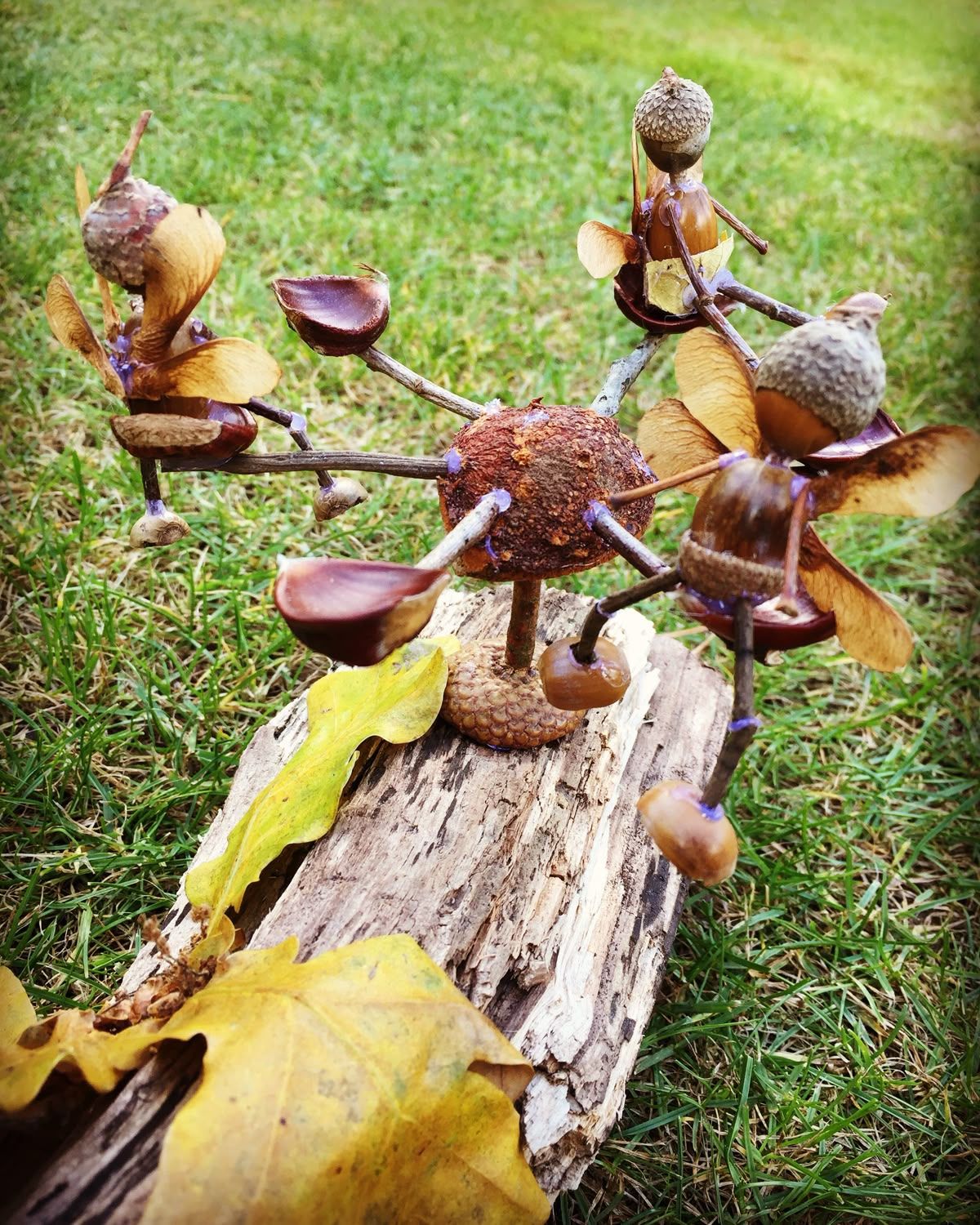 І тут для людей з фантазією згодяться і плоди – жолуді, каштани, горіхи, шишки, горобина, і гілля, і кора, і листя – сухе та свіже. А додатковими елементами стануть картон, папір, пір'їни, клей, пластилін і навіть новорічні гірлянди.