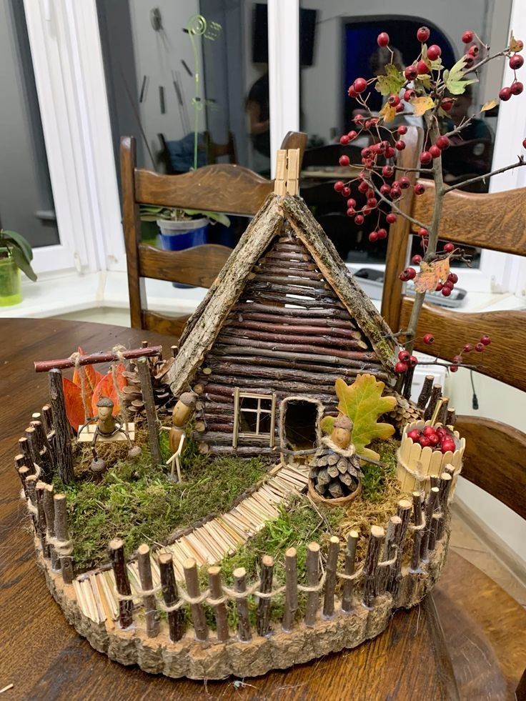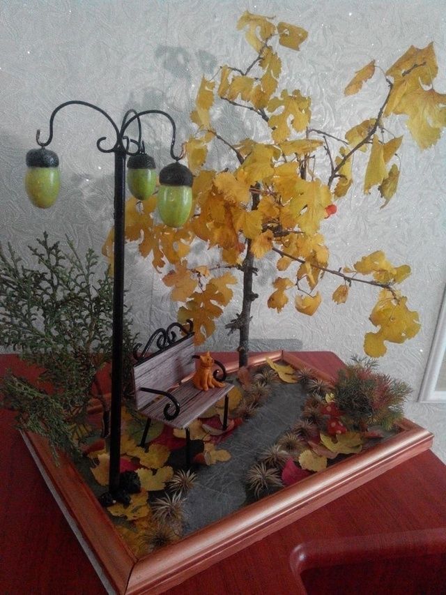 Тема осінніх затишних двориків є чи не найпопулярнішою – це і будиночки з гілок, овочів, кори, і дерева, і забори, і клумби, і навіть мешканці. А ще можна додати сходи, драбини, гойдалки, містки, лавки, ліхтарі з жолудів та інші варіанти облаштування двору.