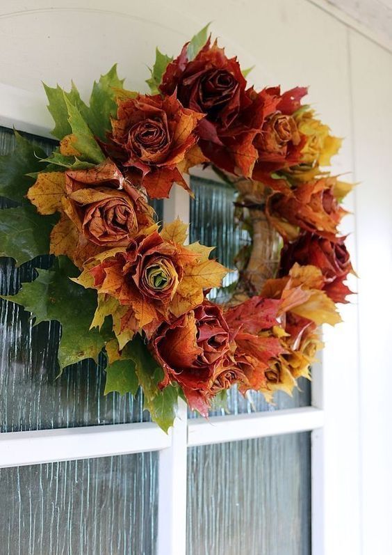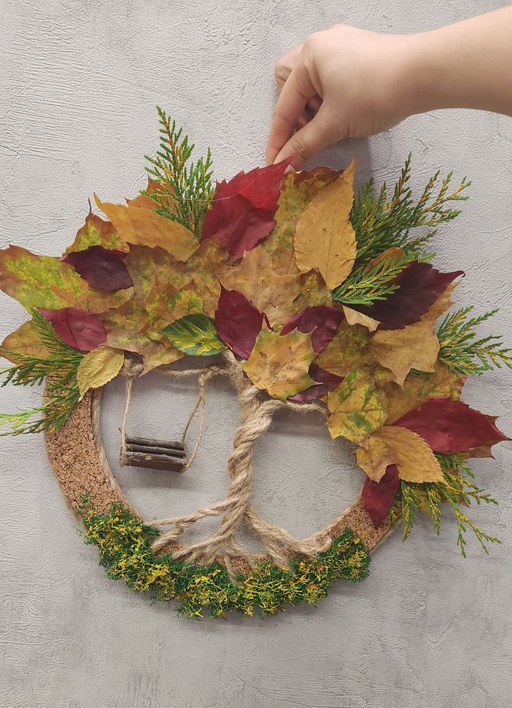 Або ж з листя та інших матеріалів можна виготовити декоративні осінні вінки. За основу може слугувати кільце з картону чи плетений з гілля чи трави вінок. Такий декор можна повісити як в середині, так і ззовні будинку.