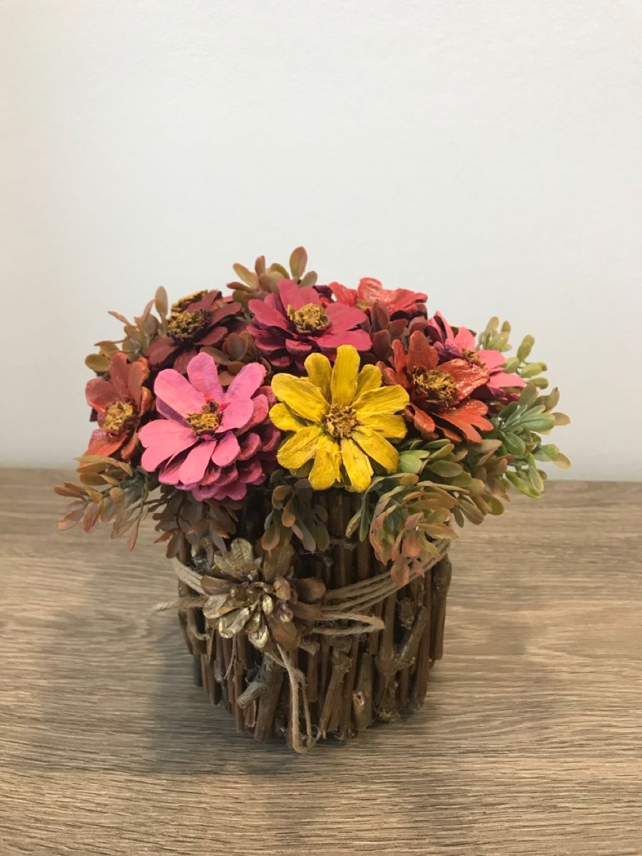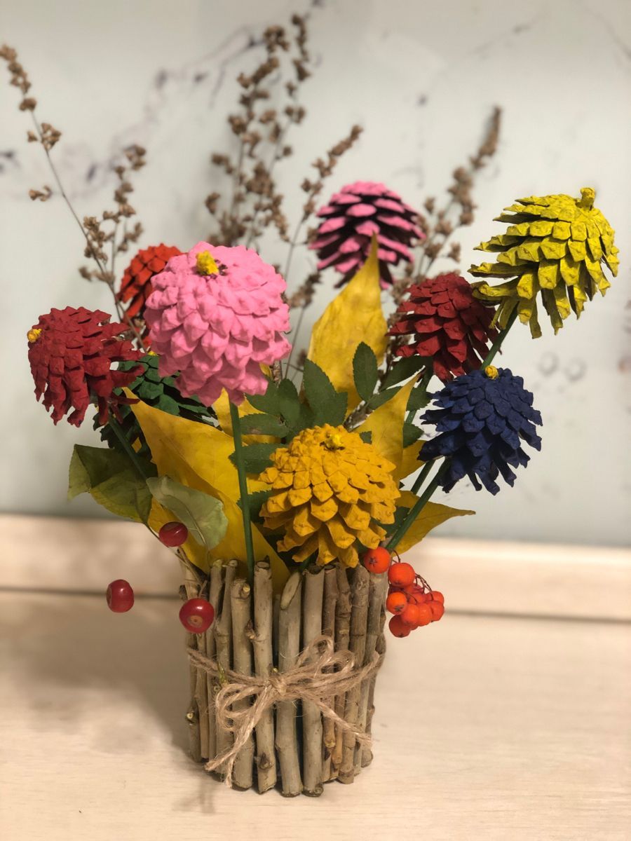Багатофункціональним матеріалом є шишки. Це не лише зимова тема. З них можна створити тварин, об'ємні кошики та навіть квіти, як можна розмалювати чи залишити в природному кольорі.