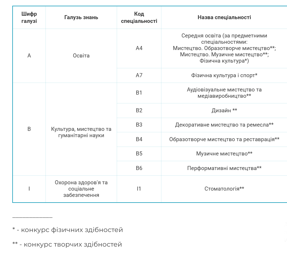 На які спеціальності треба проходити творчий конкурс / скриншот