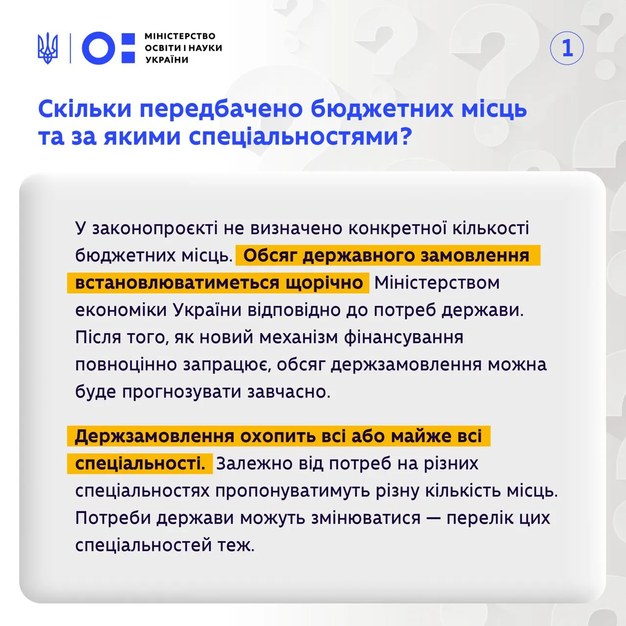 У законопроєкті не визначили, скільки буде бюджетних місць. Обсяг держзамовлення щороку встановлюватиме Мінекономіки України відповідно до потреб держави. Але обсяг держзамовлення можна буде прогнозувати завчасно. Однак після того, як новий механізм фінансування повноцінно запрацює.