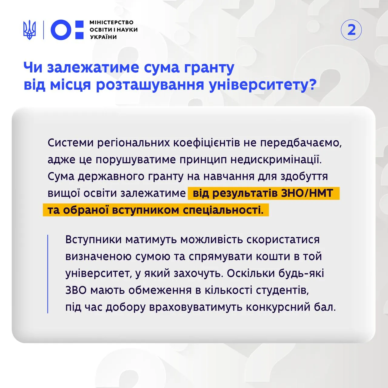 Тож вступники зможуть отриману суму гранту віддати в обраний виш. Під час добору враховуватимуть конкурсний бал вступників, адже є визначена кількість місць у виші.