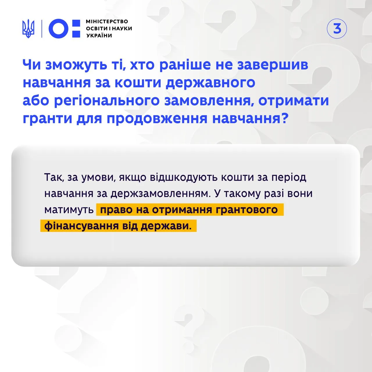 Грант зможуть отримати навіть ті вступники, які раніше не завершили навчання за кошти державного або регіонального замовлення. Але є умова. Вони повинні відшкодувати кошти за період навчання за держзамовленням.