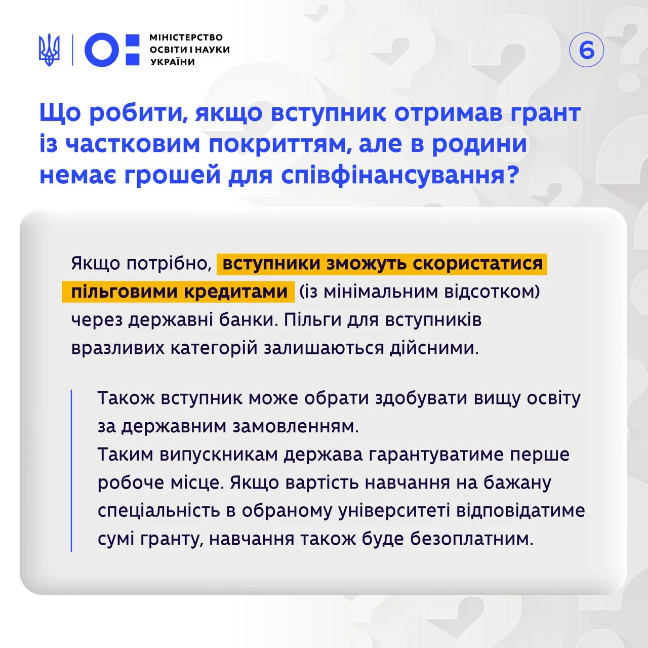 Якщо вступник отримав грант із частковим покриттям, а його родина немає грошей для співфінансування, то він може скористатися пільговими кредитами (з мінімальним відсотком) через державні банки. Пільги для вступників вразливих категорій залишаються чинними.