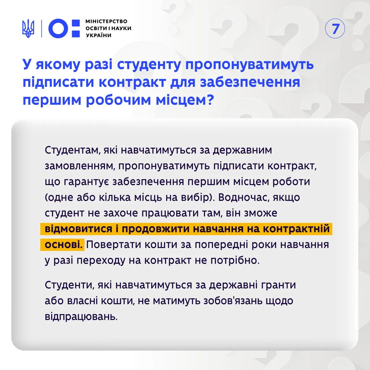 Студентам, які здобуватимуть освіту за державним замовленням, пропонуватимуть перше робоче місце або ж кілька на вибір. Відповідно нададуть контракт для підписання. Якщо студент не захоче працювати там, де йому запропонували, він зможе відмовитися і продовжити навчання – але вже на контрактній основі. Повертати кошти за попередні роки навчання у разі переходу на контракт не треба.