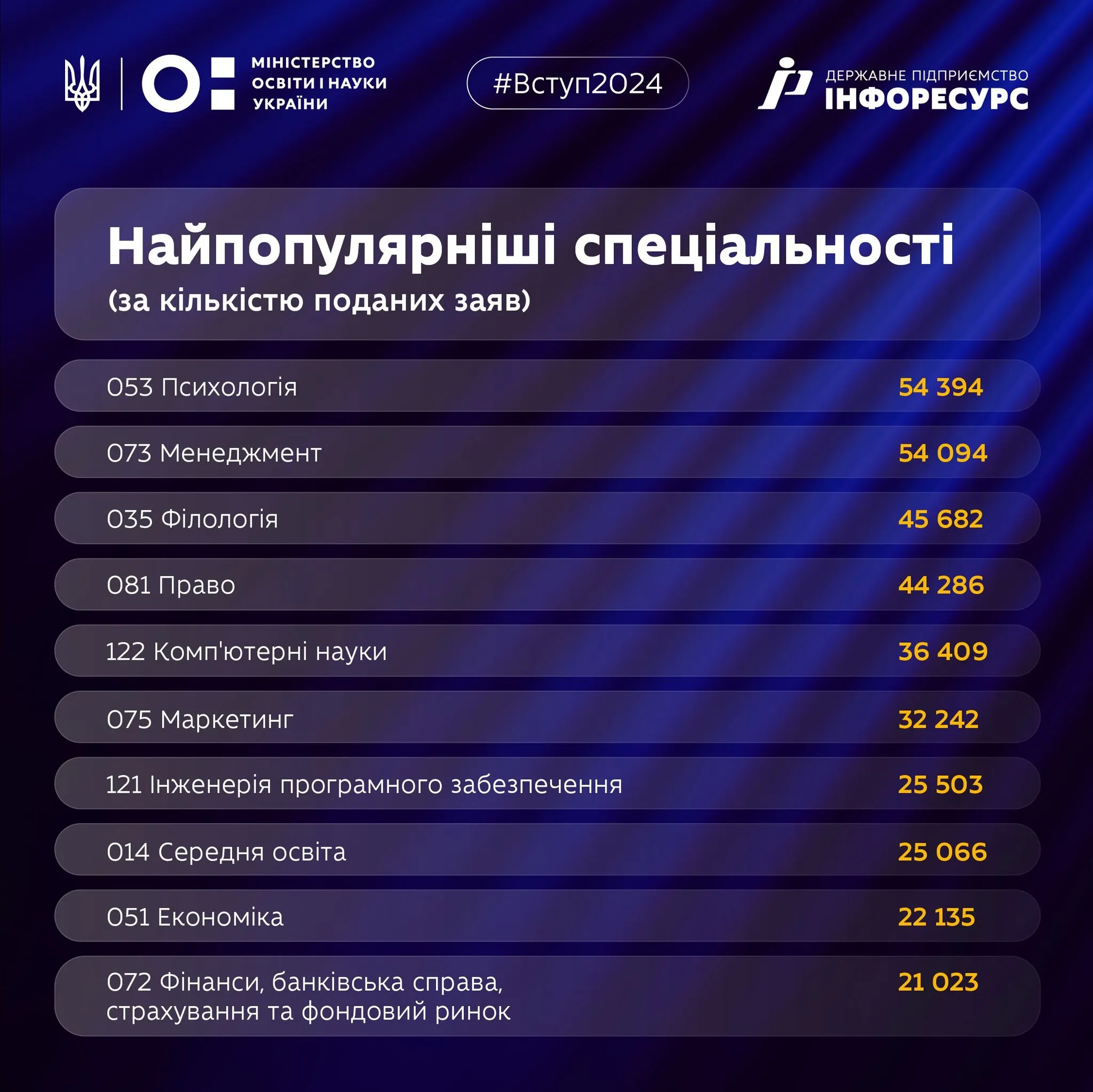 - "Комп'ютерні науки" (понад 36 тисяч заяв вступників).