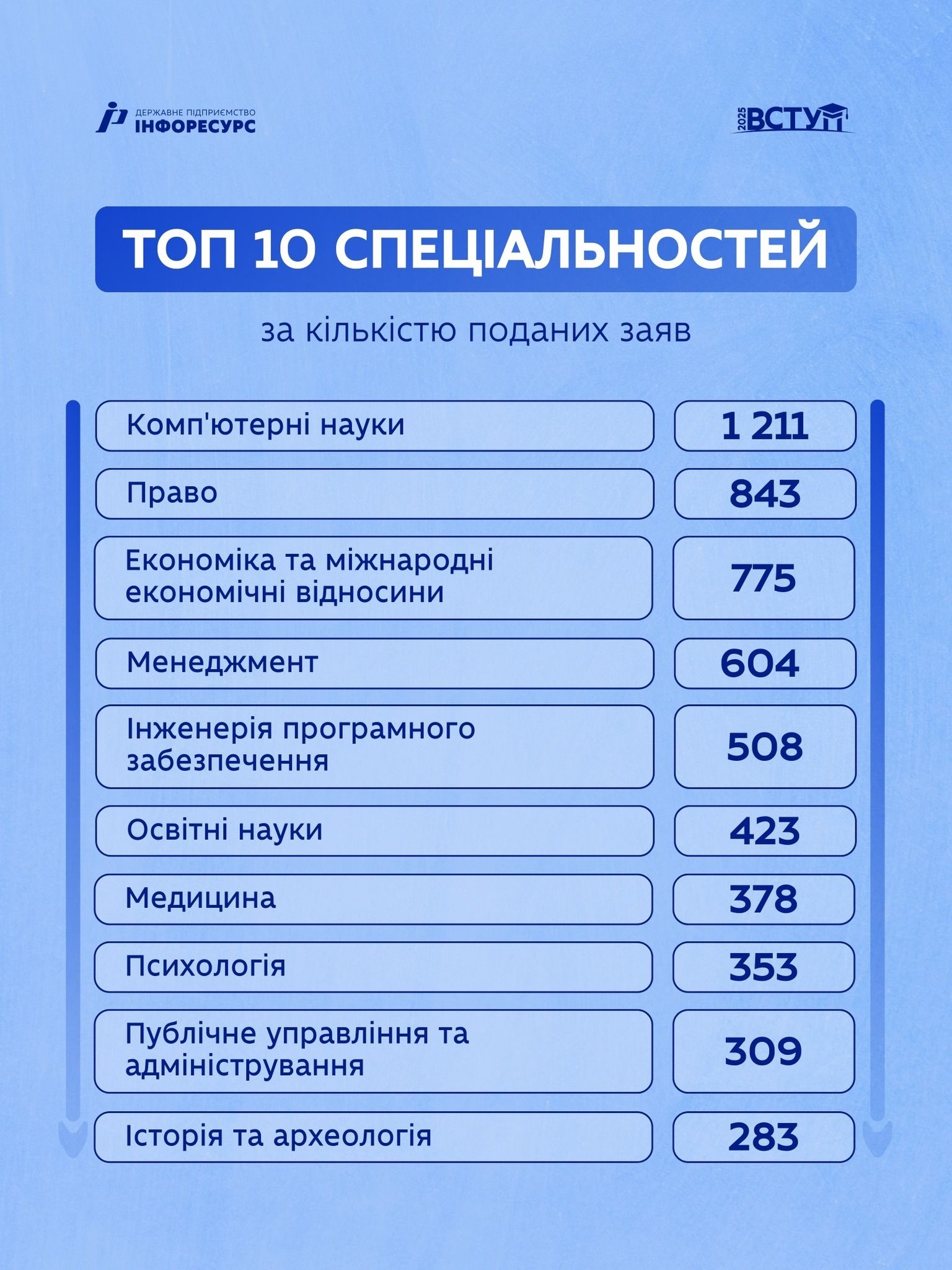 - Найпопулярнішими спеціальностями були комп'ютерні науки (1 211 заяв) та право (843 заяви).