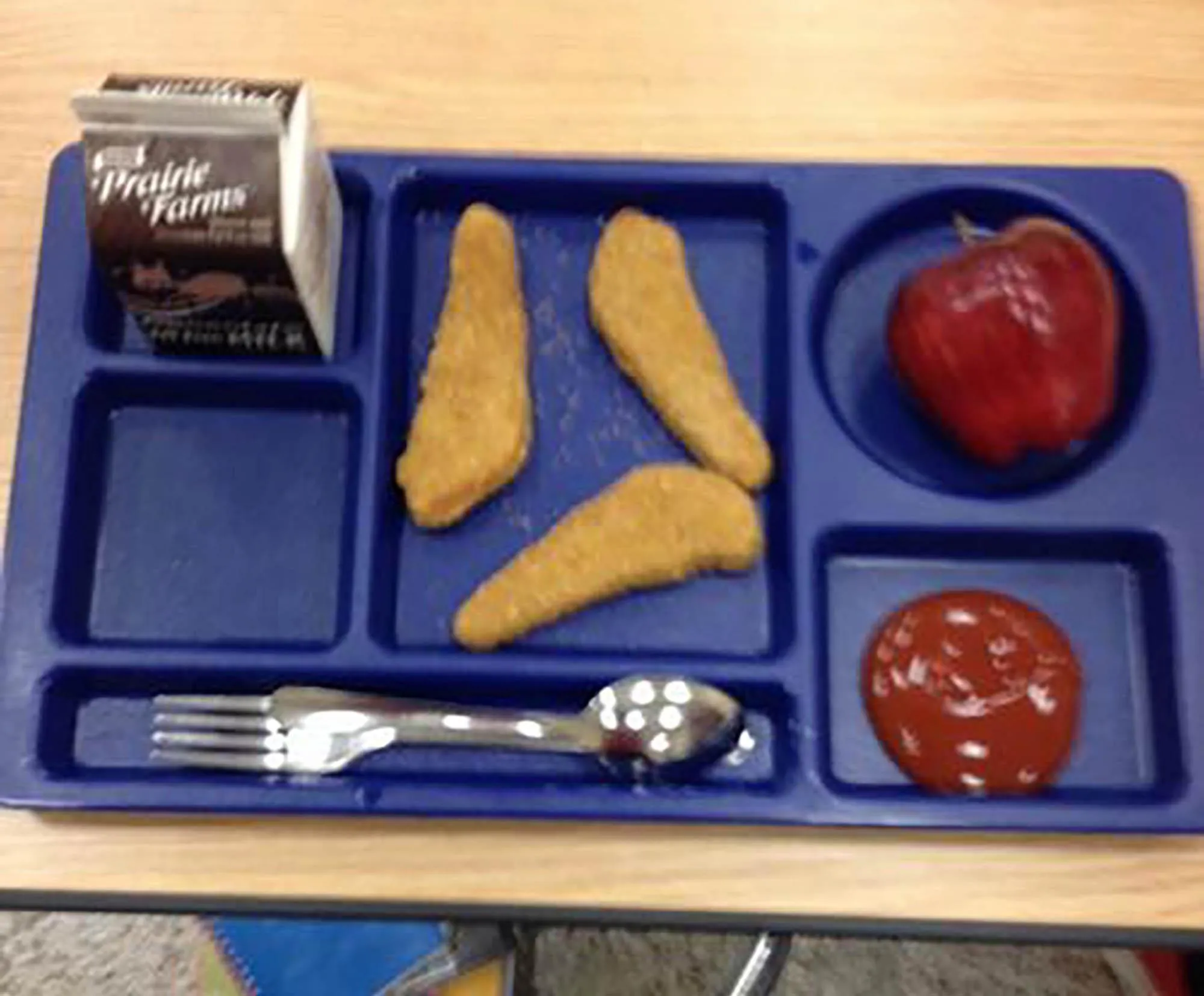 Також опублікували дуже скромне меню якогось школяра: три нагетси, кетчуп, одне яблуко та шоколадне молоко. Складно уявити, що дитина після такого обіду залишиться ситою.
