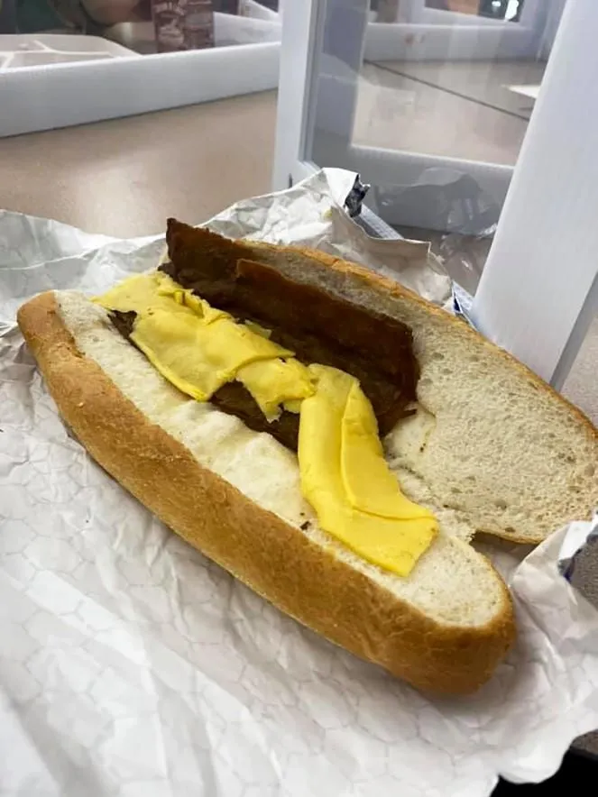 Ще один приклад шкільного обіду від Зеллі Томаса – дітям роздали поїсти хот-дог. У булочку поклали сир і ще клаптик чогось, що навіть не можна розібрати з фото. Сам викладач зазначив, що це "курячий сирний стейк".