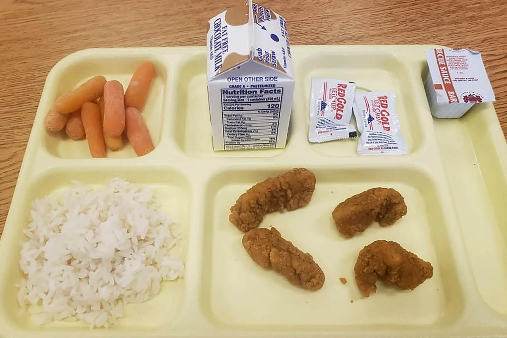 На фото від жителя Потсдама Кріса Вангеллоу: кілька смажених курячих нагетсів, бліда морквина та жменька білого рису. В упаковках – кетчуп, соус барбекю та знежирене шоколадне молоко. Виглядає обід блідо та неапетитно.