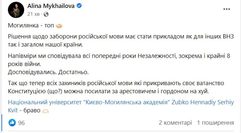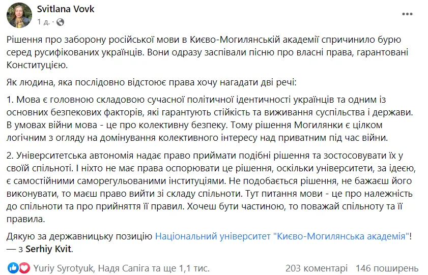 Їм на противагу – допис кандидата економічних наук, доцента, правозахисниці Світлани Вовк. Вона зауважила, що "рішення про заборону російської мови в Києво-Могилянській академії спричинило бурю серед русифікованих українців. Вони одразу заспівали пісню про власні права, гарантовані Конституцією.