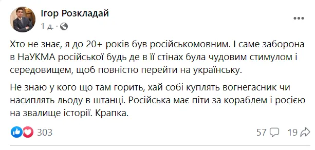 Я до 20+ років був російськомовним. І саме заборона в НаУКМА російської будь-де в її стінах була чудовим стимулом і середовищем, щоб повністю перейти на українську. Не знаю, у кого що там горить, хай собі куплять вогнегасник чи насиплять льоду в штанці. Російська має піти за кораблем і росією на звалище історії. Крапка,