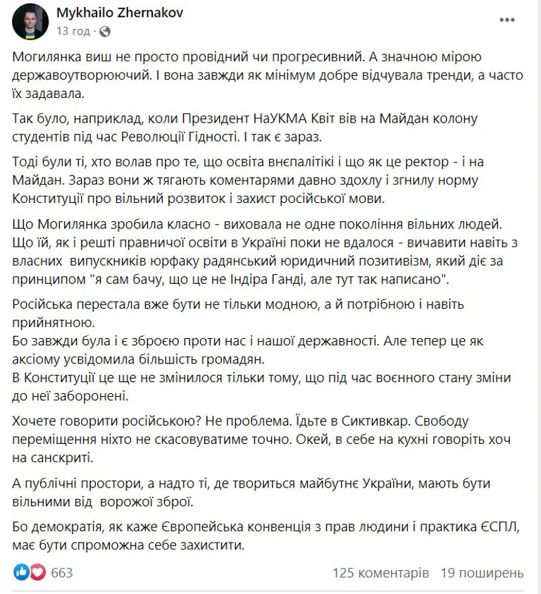 Могилянка – це не просто прогресивний український виш. І виховала не одне покоління вільних людей. Російська мова ж – зброя проти української державності. А публічні простори, а особливо ті, де твориться майбутнє України, мають бути вільними від ворожої зброї,
