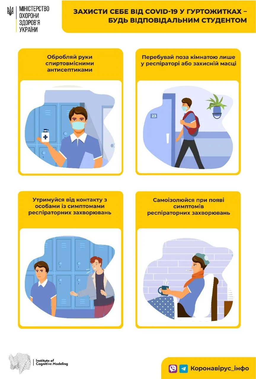 Рекомендації для безпеки студентів під час пандемії у гуртожитках / Інфографіка МОЗ