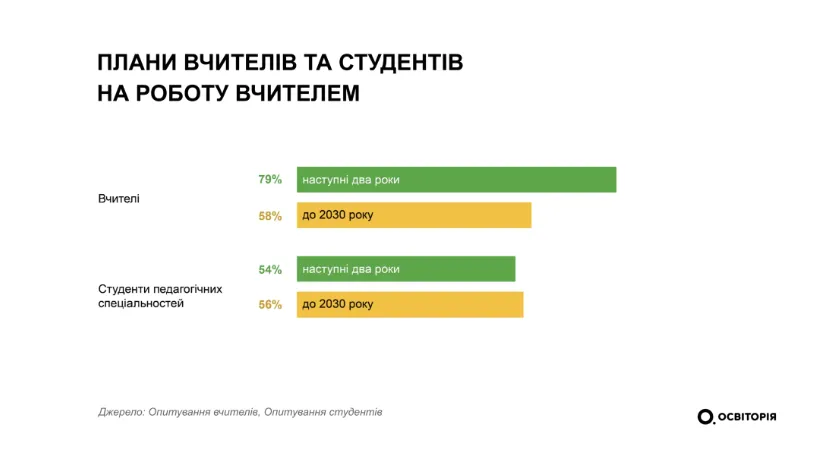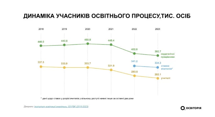 Також вчителів дедалі менше в містах та селах. Найзначніших втрат учительський склад зазнав із початком повномасштабного вторгнення: за цей час він скоротився на 12%, або майже на 40 тисяч учителів. Існує також значний розрив між учителями гуманітарних і технічних напрямків.