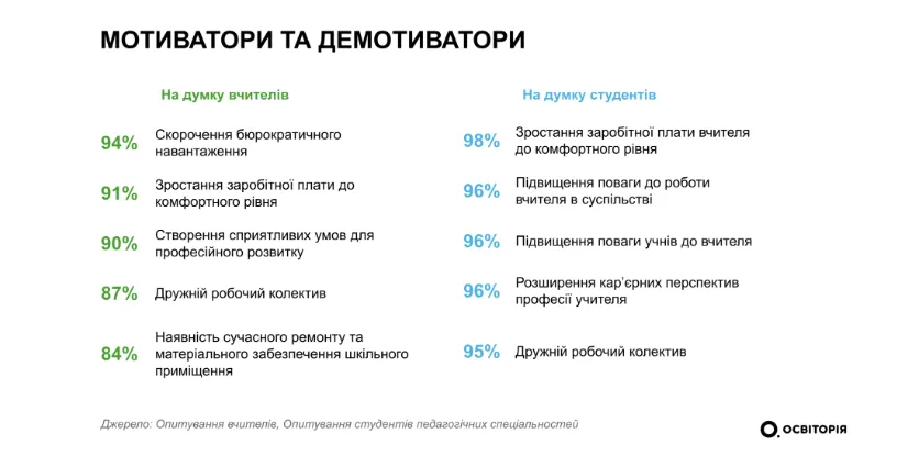 Головними демотиваторами називають бюрократію, низьку зарплату та велике навантаження. Лише 12% задоволені рівнем заробітної плати, а 94% висловилися за скорочення бюрократичного навантаження як головного мотиватора.