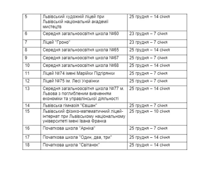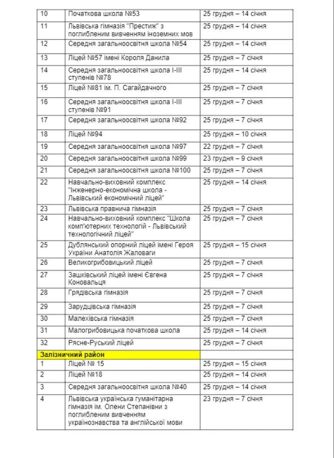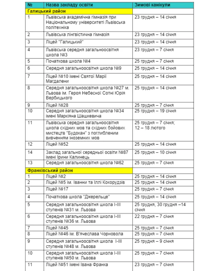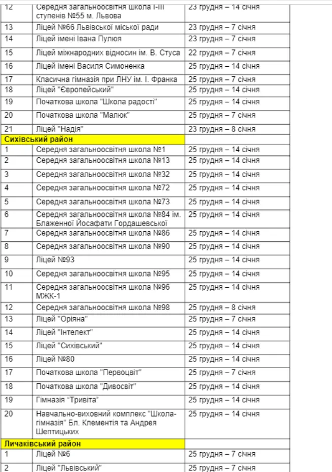Більшість учнів у місті Лева піде на зимові канікули з 25 грудня. Відпочинок решти школярів стартує в інші дні.