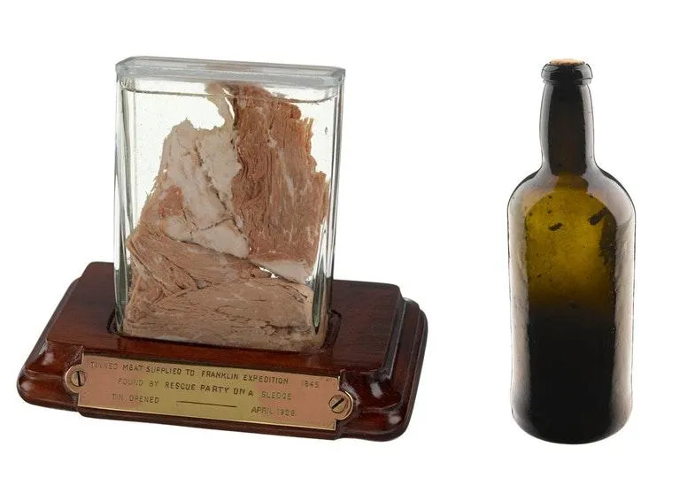 Зразок консервованого м'яса і порожня пляшка вина з останньої експедиції Франкліна