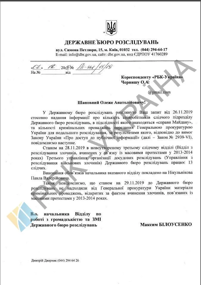 Відповідь ДБР на запит журналістів / фото "РБК-Україна"