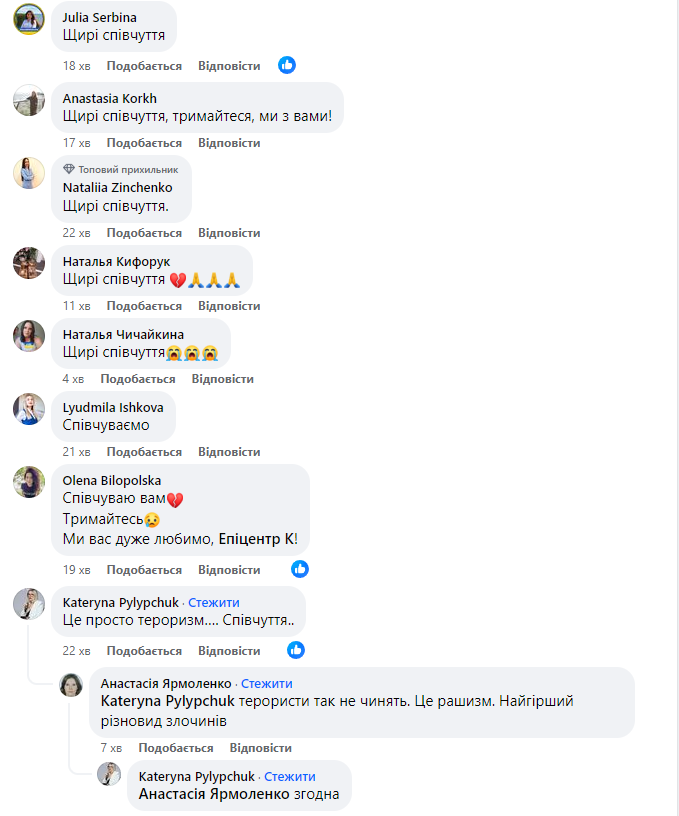 Під публікаціями українці залишають десятки коментарів зі співчуттями. Українці наголошують, що такий удар є цинічним терористичним актом та справжнім воєнним злочином.