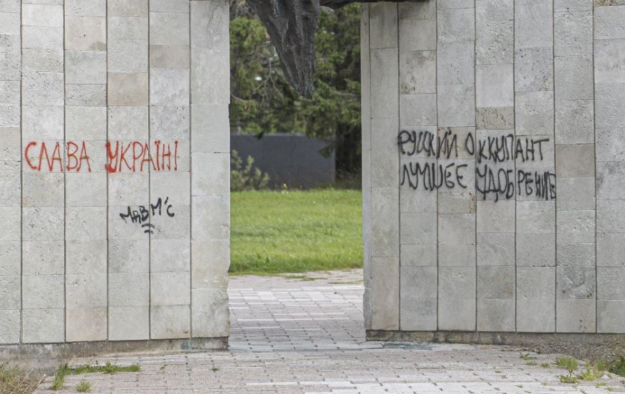 Видання також виклало фотографії пам'ятника з різних ракурсів. На них можна побачити, зокрема, й написи, що, ймовірно, були зроблені раніше. Серед разноманітних графіті є слоган, що був нанесений кілька разів на різних місцях об'єкта. На ньому російського диктатора Владіміра Путіна називають карликом та порівнюють з екскрементами.