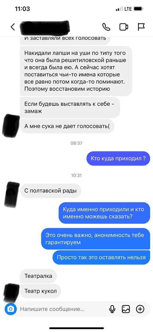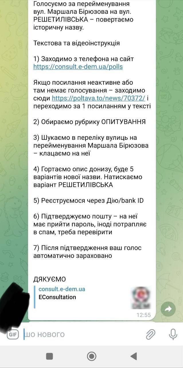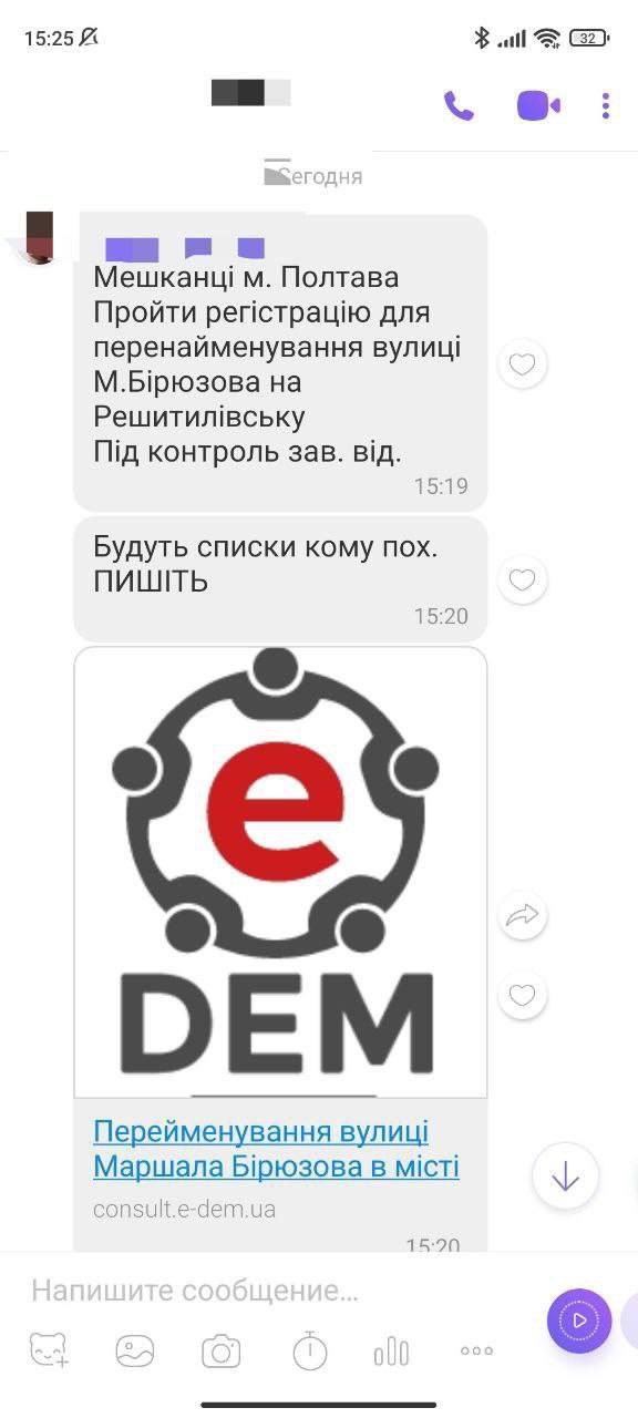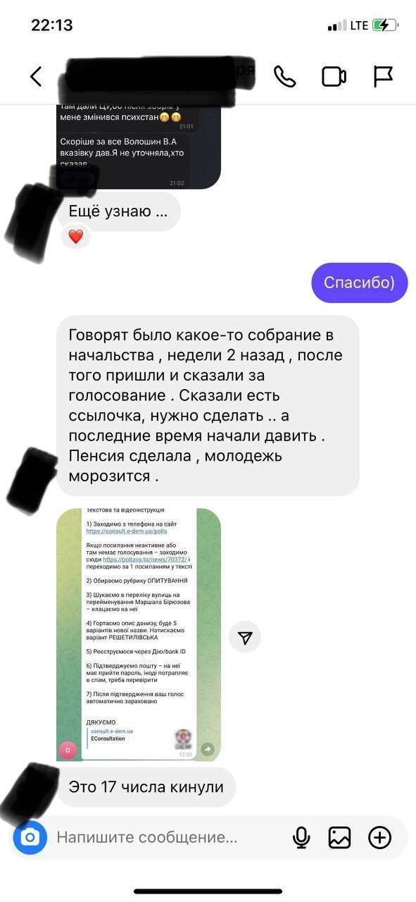 Катерина стверджує, що у неї є скриншоти стосовно того, що в закритих групах держустанов керівництво виставляє певні умови працівникам, аби вони проголосували саме за назву Решетилівська.