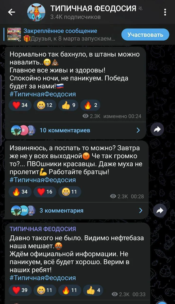 Місцеві жителі у мережі бідкалися на потужні вибухи у Феодосії. Так, вони заявляли, що від вибухів здригалися вікна та стіни. На опублікованих відео також чутно потужні вибухи, а також видно спалахи від ураження об'єкта.