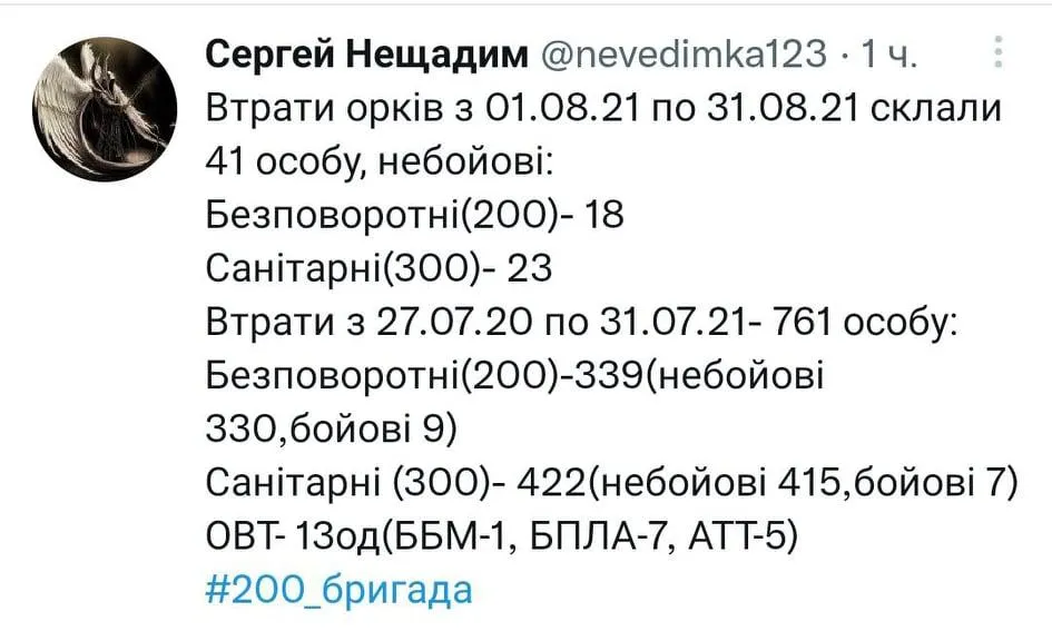 Окрім цього, він оприлюднив дані, які свідчать, що за час дії перемир'я на Донбасі з 27 липня 2020 року по 31 липня 2021 року втратити окупантів склали 761 особа: