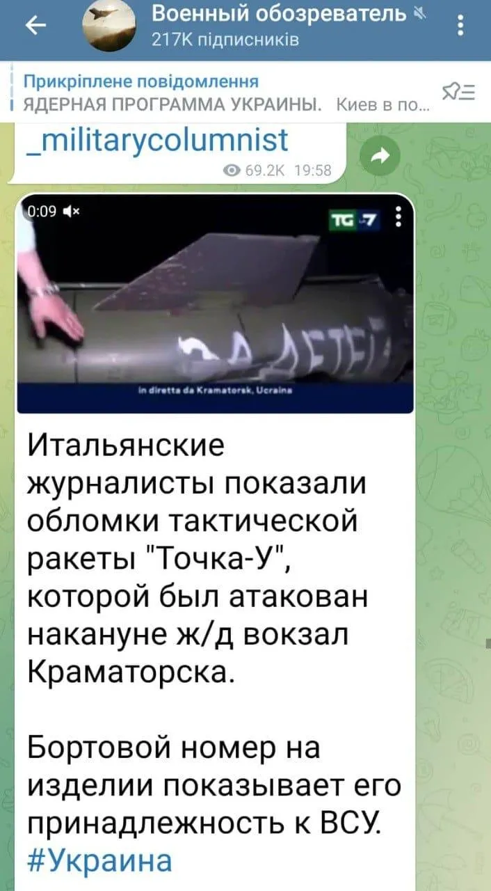 Так, пропагандисти поширюють інформацію, нібито італійський журналіст з TG-7 по бортовому номеру виявив, що ракета, яка атакувала Краматорськ, "українська".
