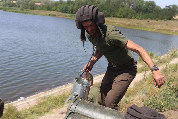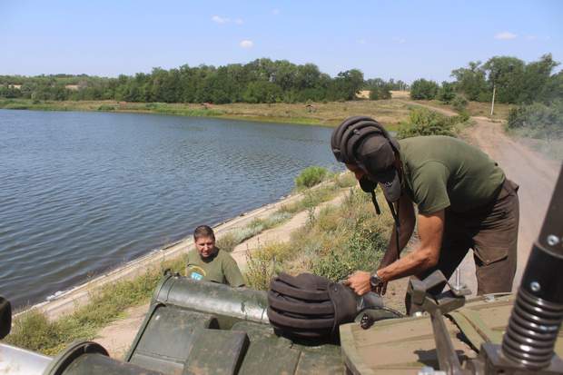 Ще в дорозі я помітив, як дбайливо командир пригинає антену з прапором, щоби стяг не зачепили гілки дерев. Як злагоджено, швидко і з любов'ю працюють воїни, коли виникла нагода поповнити холодною водою якусь із систем їх гусеничного "ведмедя". Після прибуття на місце задоволені і чорні від пилу, наче чортяки, ми все одно не одразу змогли почати розмову. Справжні герої, яким є що розказати, переважно небагатослівні. Таке враження, що цей матеріал не розповість нам і десятої частини їх бойової біографії. Але й того, що вдалося почути, вистачило б на декілька пригодницьких фільмів.