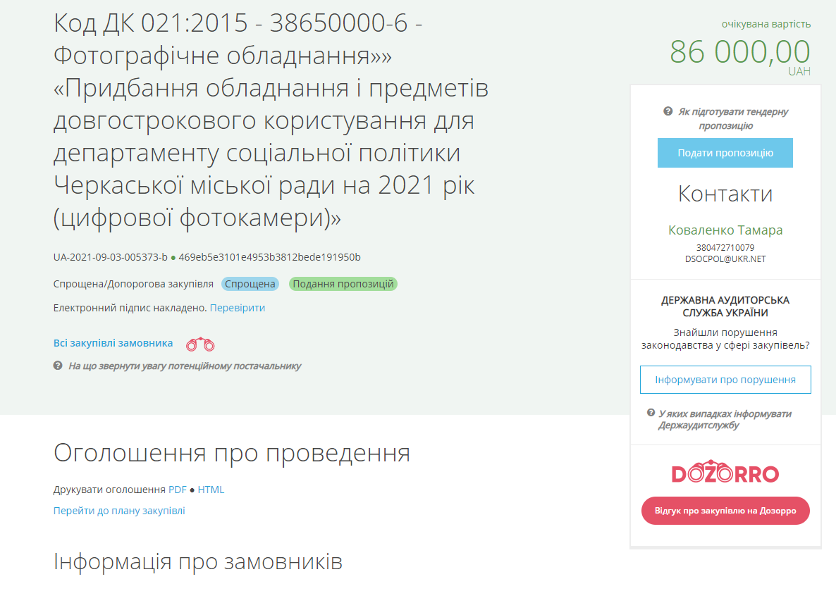 Тендер на закупівлю фотоапарату / Скриншот із сайту ProZorro