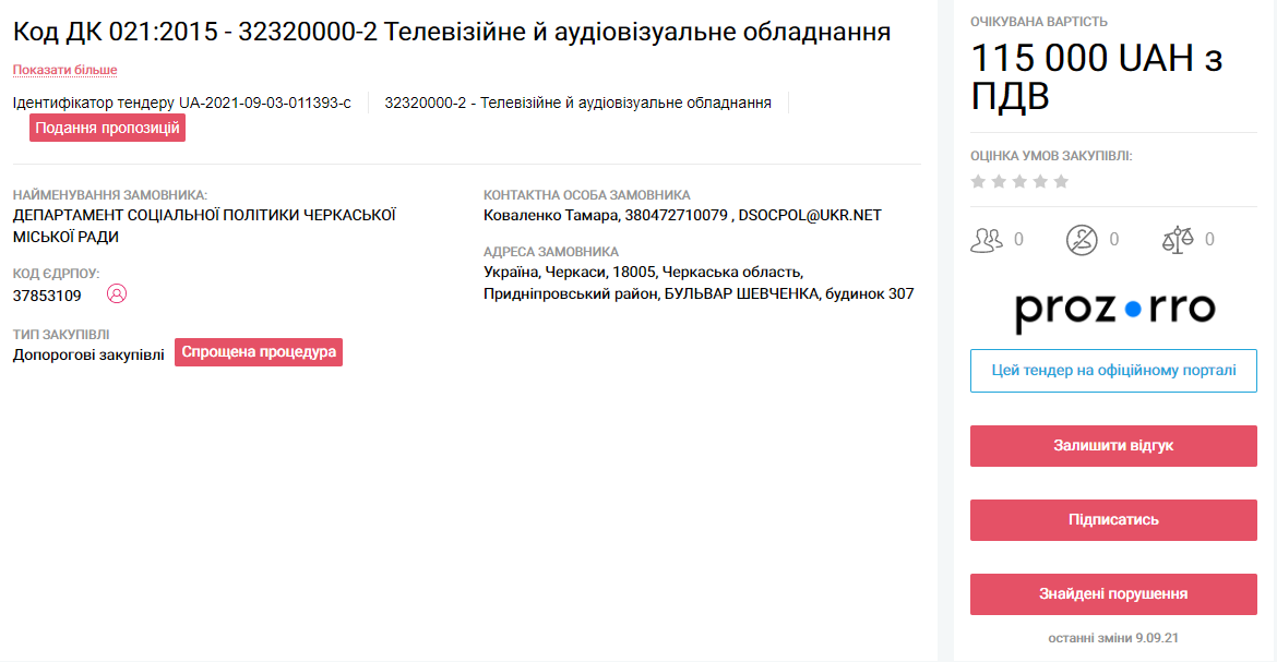 Тендер на закупівлю телевізора та комп'ютера / Скриншот із сайту ProZorro
