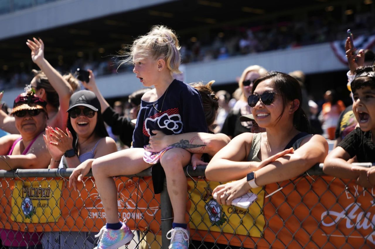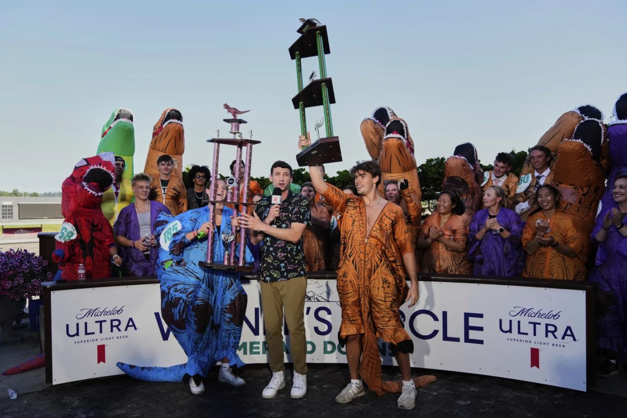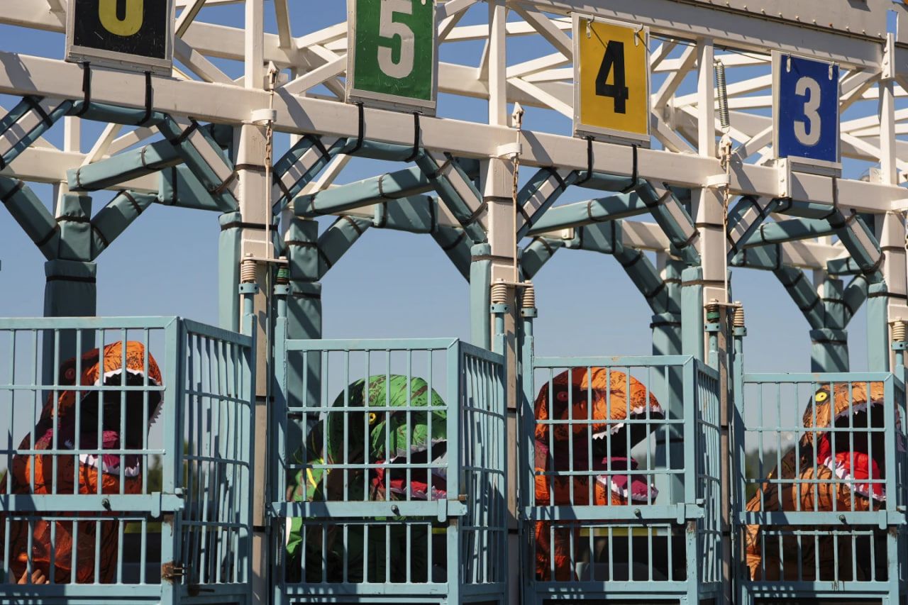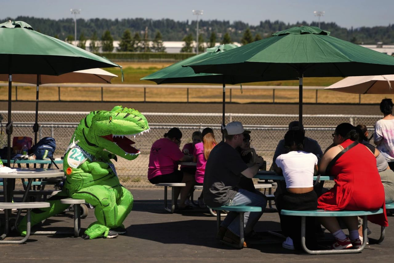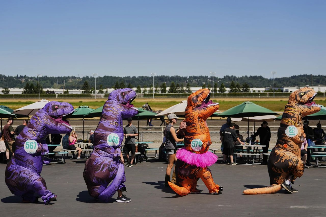Глядачі вітали оплесками учасників, які бігли по доріжці, загорнуті в надувні костюми тиранозавра, під час "Чемпіонату світу з бігу T-Rex" на іподромі Emerald Downs в Оберні, штат Вашингтон,