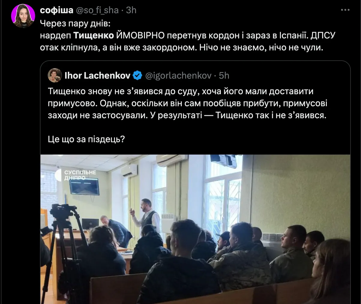 Багато хто також зазначає, що Микола Тищенко не з'явився на засіданні суду, бо вже вирушив за кордон.
