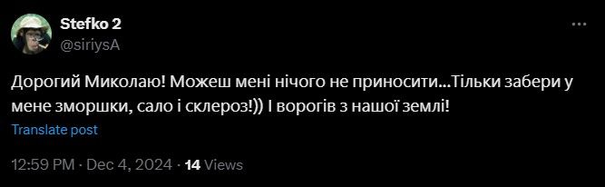 Своими желаниями украинцы уже традиционно делились в сети. На фоне регулярных обстрелов России и отключений света некоторые пожелали, чтобы Николай освободил цивилизацию от дикарей.