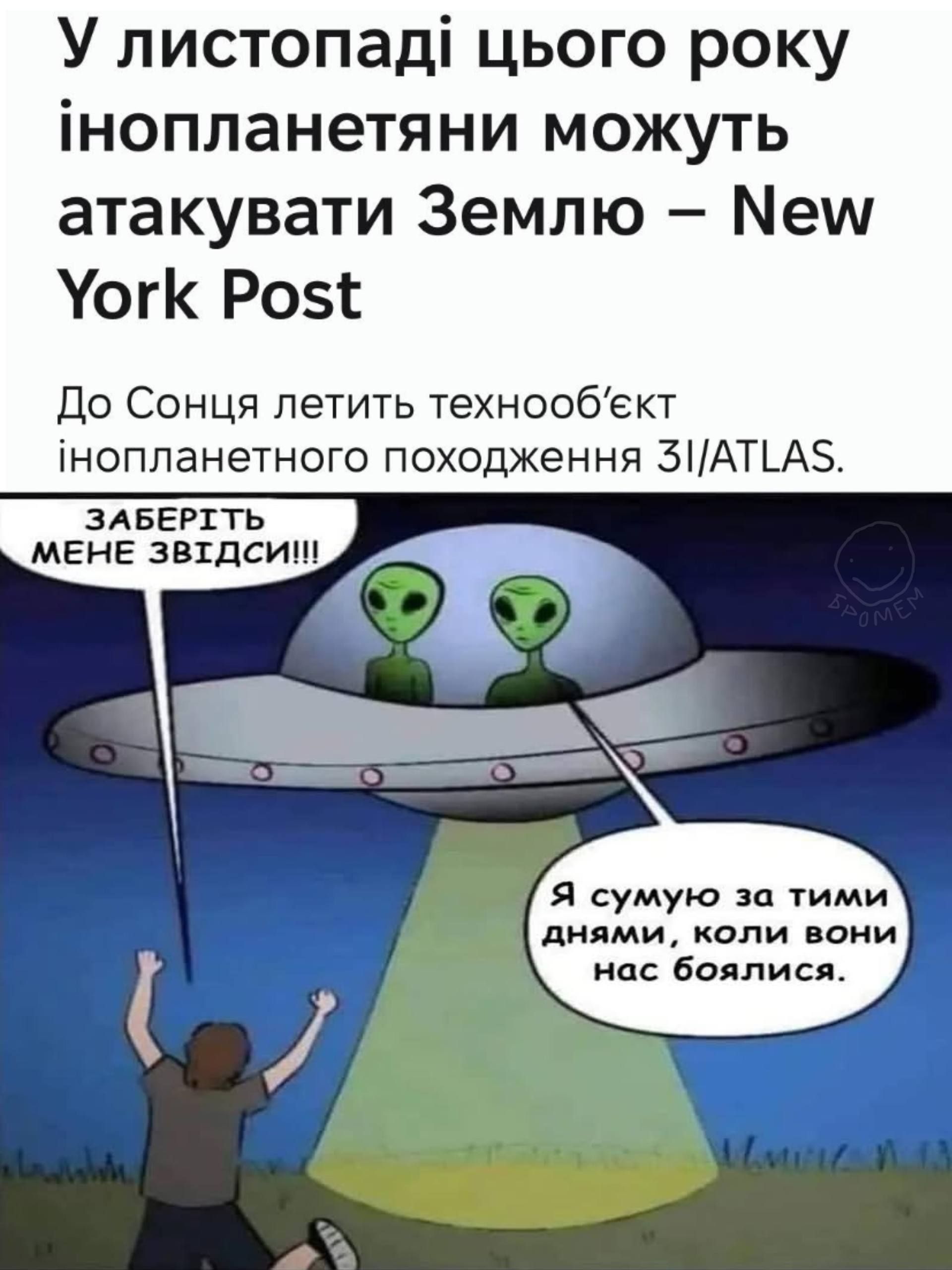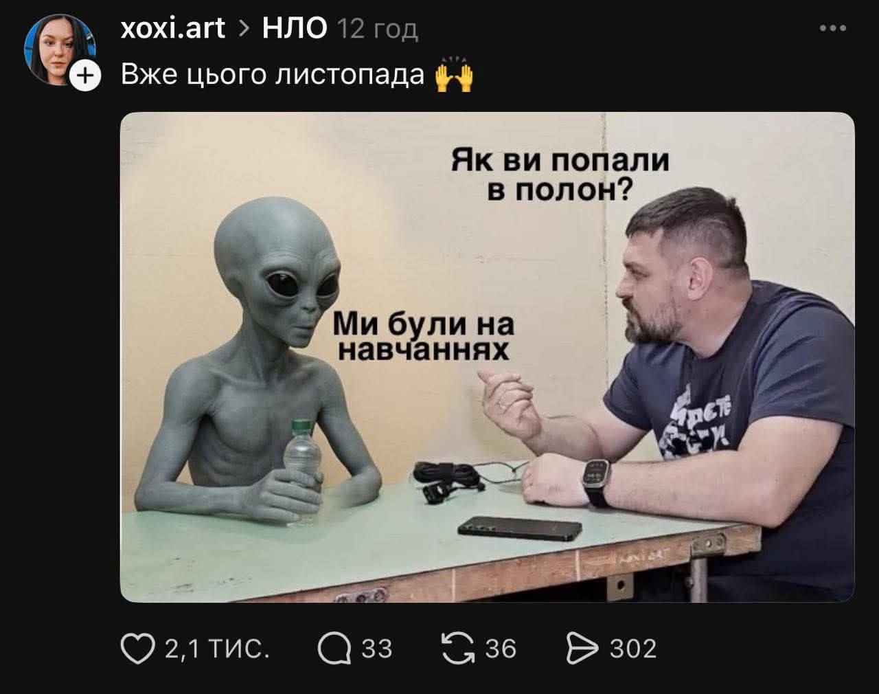После лет войны, пандемий и реальных ракетных обстрелов сообщение об инопланетянах не вызвало у украинцев страха. Наоборот – пользователи соцсетей начали массово делиться шутками.
