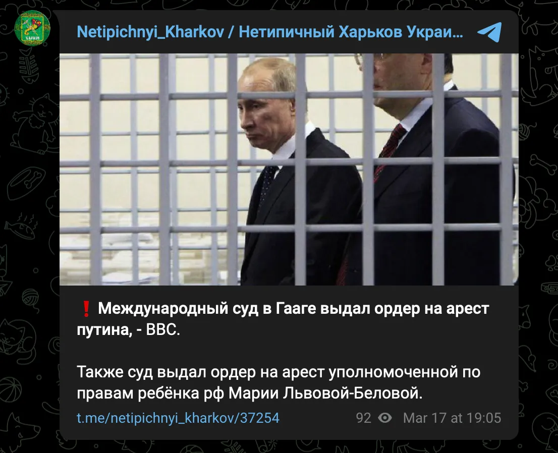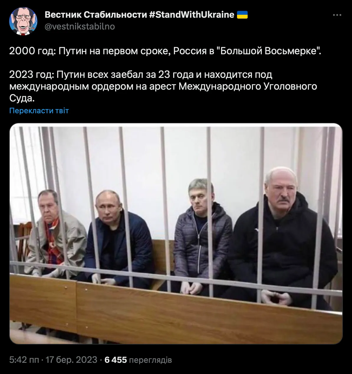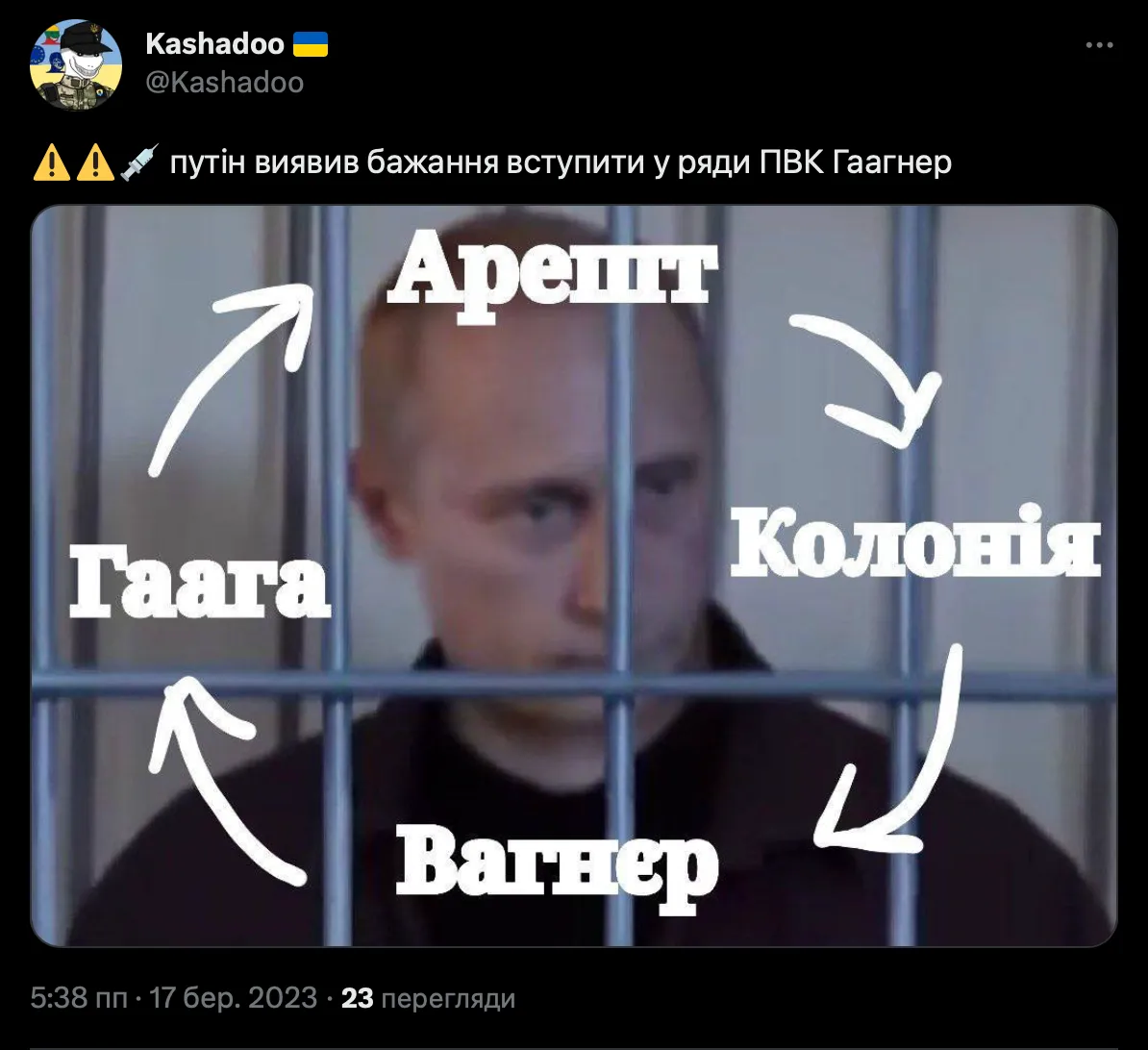 - 2023 рік: Путін усіх за**ав за 23 роки і перебуває під міжнародним ордером на арешт Міжнародного кримінального суду.
