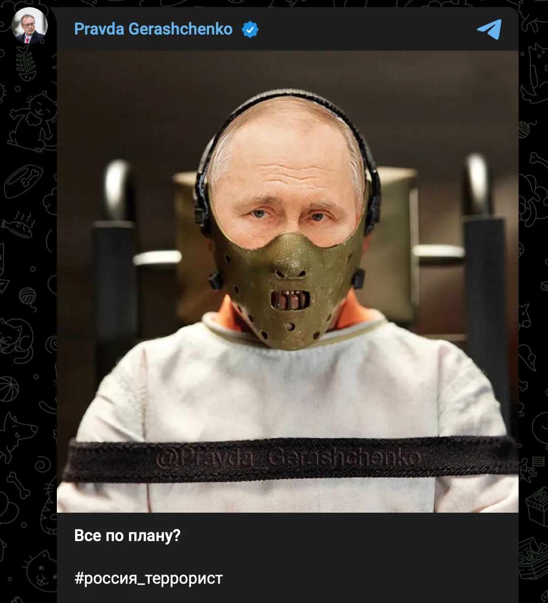 Антон Геращенко в ударі. Тож він опублікував ще одну фотожабу. На ній Путін зображений у ролі Ганнібала Лектора. Нагадуємо, що він був американським серійним маніяком.