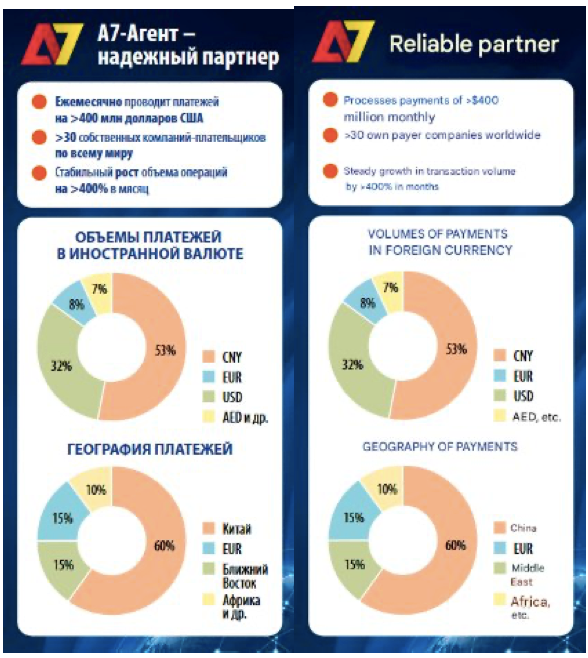 Компанія A7 має мережу підставних компаній в ОАЕ та Китаї, які використовуються для обходу санкцій. Вона активно розширює свою діяльність, відкриваючи офіси в Росії та інших країнах, зокрема в Китаї та Африці. A7 рекламує свої послуги для великих і малих підприємств, обробляє щодня близько 1500 транзакцій.