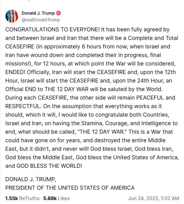 Високопоставлений іранський чиновник підтвердив агентству Reuters, що Тегеран погодився на перемир'я з Ізраїлем, запропоноване США за посередництва Катару. В Sky News також повідомили, що іранський чиновник підтверджує згоду Тегерана на припинення вогню. Ізраїльські лідери намагаються розробити точну стратегію виходу, яка дозволить завершити кампанію і покласти край ракетним і безпілотним атакам Ірану, щоб уникнути ударів "око за око", які б паралізували країну, Журналісти пояснили: Ізраїль справді несподівано вдарив по Ірану, але "він не може контролювати, коли закінчиться конфлікт". Таким чином, Тель-Авів може бути "втягнутим у дорогу війну на виснаження, якщо Тегеран вирішить продовжити боротьбу". ЗМІ повідомили, що Трамп не хоче продовжувати удари по Ірану. Іран заявив, що їхні удари – частина операції під назвою "Оголошення перемоги". Там буцімто випустили стільки ж ракет, скільки і США. Американська база в Сирії переведена в "повну бойову готовність" на тлі іранських ударів 23 червня. Це основна діюча база США на північному сході Сирії – Касрак. За словами сирійського джерела у сфері безпеки, це одна з двох американських баз у регіоні, і зараз вона мобілізована в очікуванні можливого нападу. У The New York Times із посиланням на посадовців написали, що американська авіабаза Аль-Удейд у Катарі не зазнала ураження внаслідок іранського обстрілу. Ця авіабаза – найбільший американський військовий об'єкт на Близькому Сході, який був основною ціллю Ірану. Вона служить регіональною штаб-квартирою Центрального командування США, а розміщено там близько 10 000 військовослужбовців. ЗМІ пишуть, що Тегеран за кілька годин до атаки поінформував противника. Таке рішення, ймовірно, пов'язане з бажанням мінімізувати втрати. Невдовзі після іранських атак по базах США Ізраїль завдав ударів по Тегерану. Опісля 20:30 вечора в столиці Ірану пролунали вибухи. ЗМІ стверджують, що Сили оборони Ізраїлю завдали удару по місту. Ізраїль продовжуватиме завдавати ударів на всіх рівнях іранського режиму, В Ірані прокоментували подію, заявивши, що дійсно атакували авіабазу Аль-Удейд у Катарі після "відвертої військової агресії" "злочинного режиму Сполучених Штатів Америки". Тегеран заявив, що "не залишить без відповіді жодного нападу на свою територіальну цілісність, суверенітет та національну безпеку за жодних обставин". У Білому домі заявили, що президент США та Міноборони "уважно стежать" за потенційними загрозами для авіабази Аль-Удейд у Катарі. Тим часом Дональд Трамп разом зі своєю командою також перебуває в ситуаційній кімнаті. Президент також був там на вихідних, коли віддавав наказ про завдання ударів по Ірану, що призвело до такої реакції, У Катарі заявили, що внаслідок іранської атаки немає жертв та постраждалих. У МЗС країни запевнили, що протиповітряна оборона Катару перехопила ракетний удар. Там також вказали, що повітряний простір і територія країни є "безпечними". У понеділок, 23 червня, Іран випустив ракети по авіабазах США Аль-Удейд у Катарі та Айн-аль-Асад в Іраку. У мережі поширили кадри обстрілу в Катарі: дивіться відеоТрамп заявив про досягнення угоди між Іраном та Ізраїлем